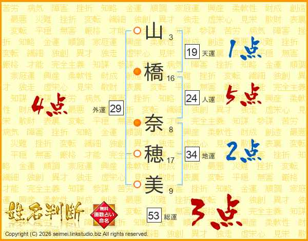 山(3画)橋(16画) 奈(8画)穂(17画)美(9画)