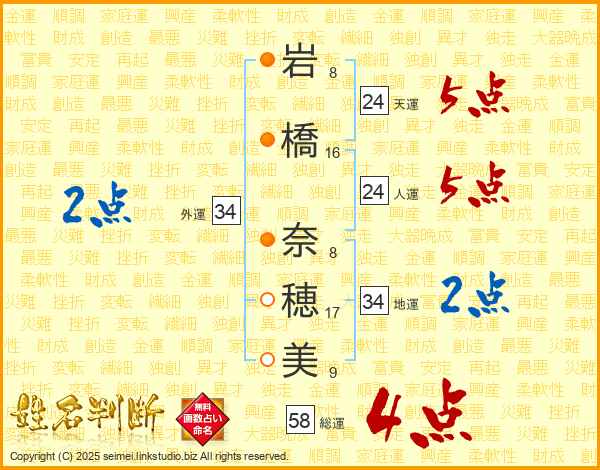 岩(8画)橋(16画) 奈(8画)穂(17画)美(9画)