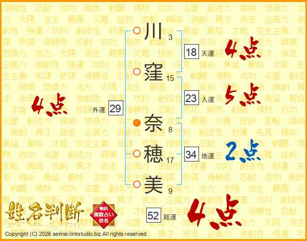 川(3画)窪(15画) 奈(8画)穂(17画)美(9画)