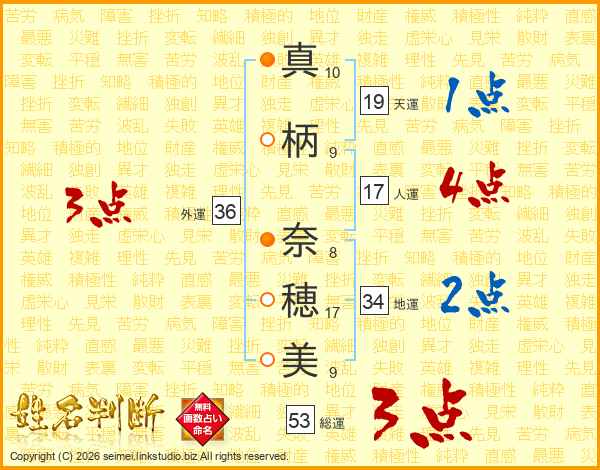 真(10画)柄(9画) 奈(8画)穂(17画)美(9画)