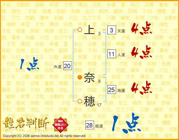 生活面を象徴する運勢です。外部から受ける影響力を表し、結婚運、家庭運や職場、環境への順応性を表します。総運から人運を引いた画数。姓や名が1文字の場合を除く。