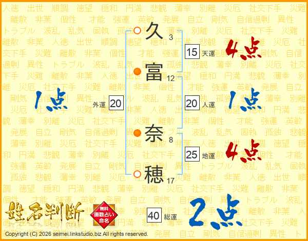 久(3画)富(12画) 奈(8画)穂(17画)