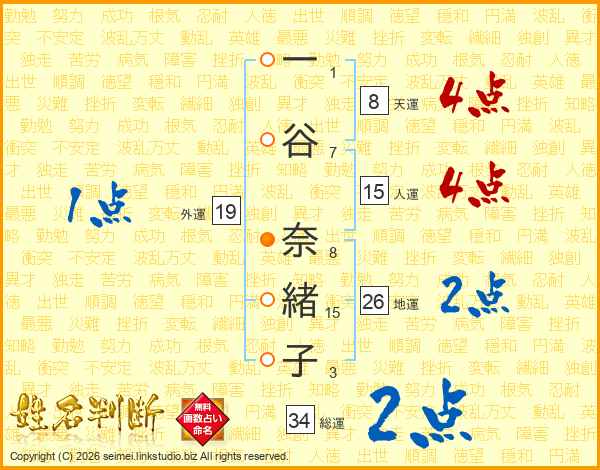一(1画)谷(7画) 奈(8画)緒(15画)子(3画)