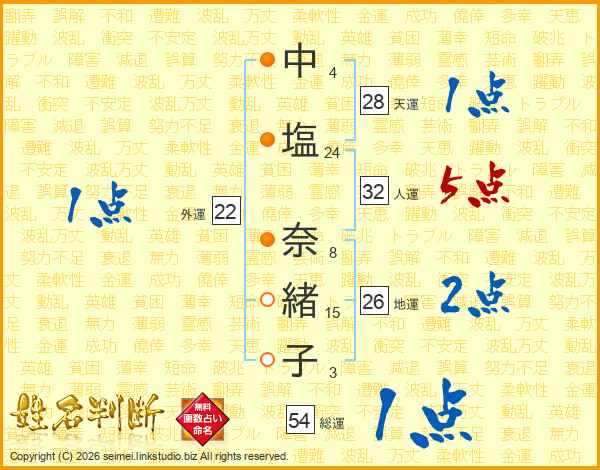 中(4画)塩(24画) 奈(8画)緒(15画)子(3画)