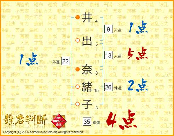 井(4画)出(5画) 奈(8画)緒(15画)子(3画)