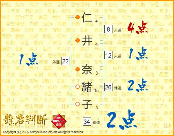 仁(4画)井(4画) 奈(8画)緒(15画)子(3画)
