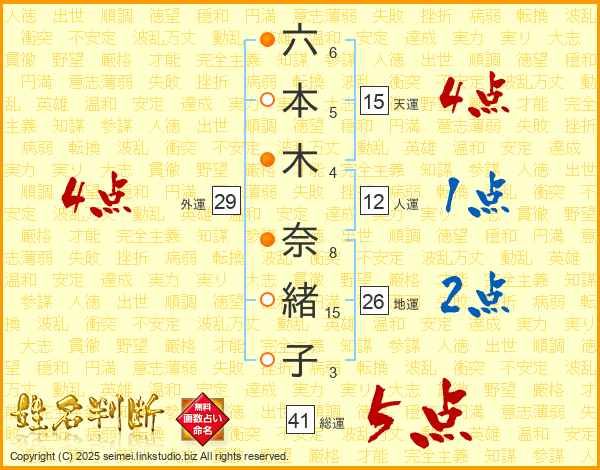 六(6画)本(5画)木(4画) 奈(8画)緒(15画)子(3画)
