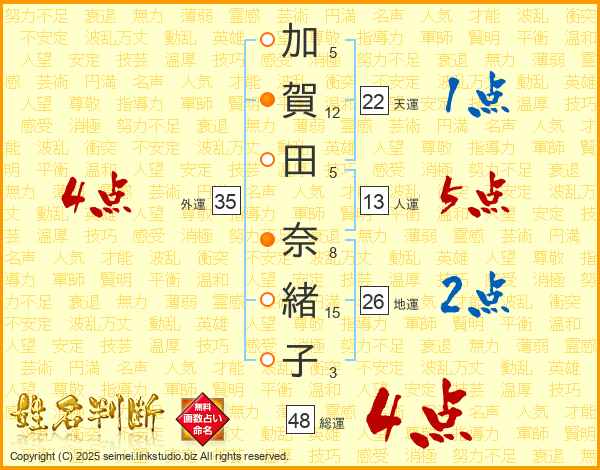 加(5画)賀(12画)田(5画) 奈(8画)緒(15画)子(3画)