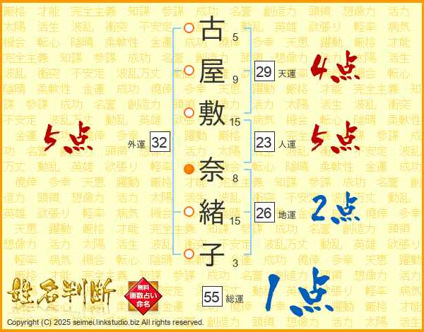 古(5画)屋(9画)敷(15画) 奈(8画)緒(15画)子(3画)
