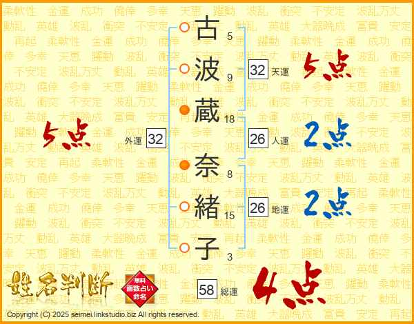 古(5画)波(9画)蔵(18画) 奈(8画)緒(15画)子(3画)
