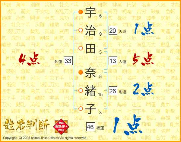 宇(6画)治(9画)田(5画) 奈(8画)緒(15画)子(3画)