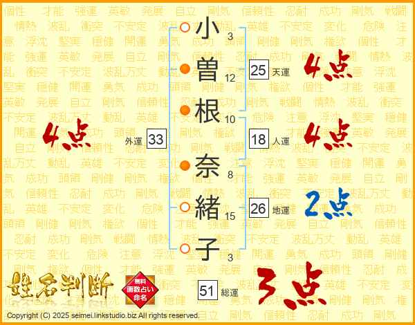 小(3画)曽(12画)根(10画) 奈(8画)緒(15画)子(3画)