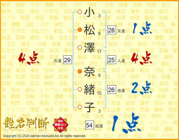 小(3画)松(8画)澤(17画) 奈(8画)緒(15画)子(3画)