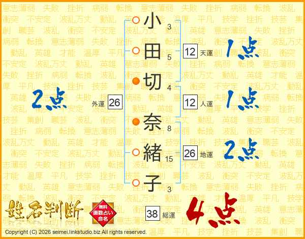 小(3画)田(5画)切(4画) 奈(8画)緒(15画)子(3画)