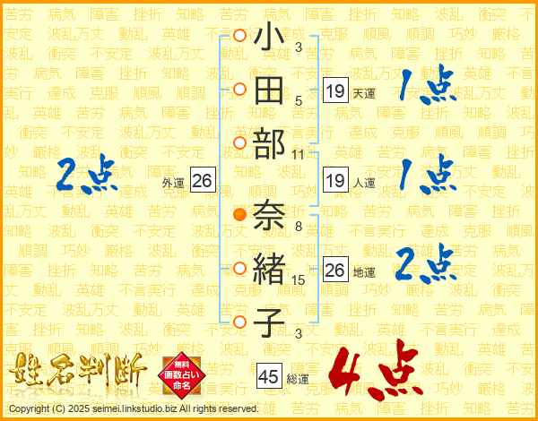 小(3画)田(5画)部(11画) 奈(8画)緒(15画)子(3画)