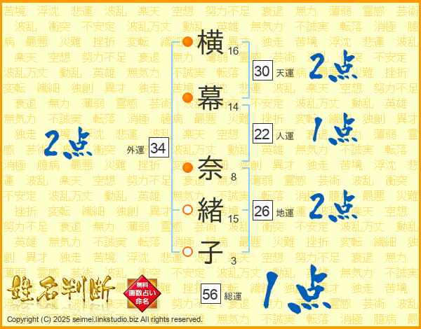 横(16画)幕(14画) 奈(8画)緒(15画)子(3画)