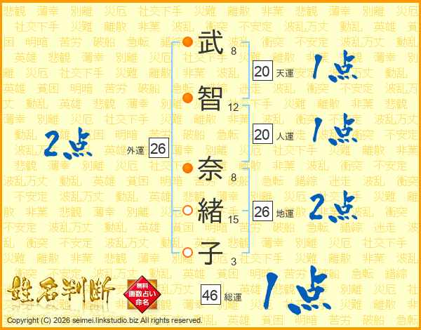 武(8画)智(12画) 奈(8画)緒(15画)子(3画)