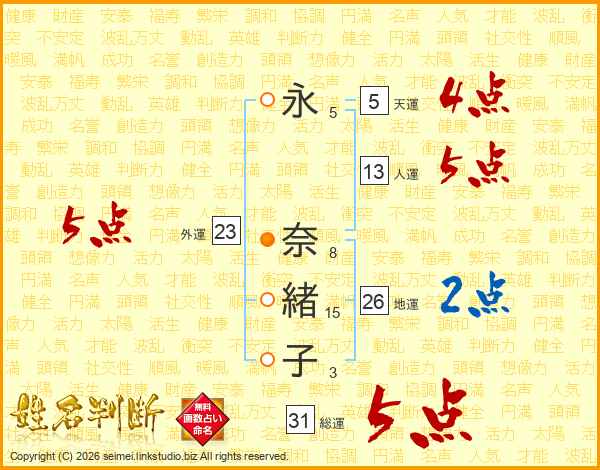 永(5画) 奈(8画)緒(15画)子(3画)