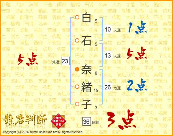 白(5画)石(5画) 奈(8画)緒(15画)子(3画)