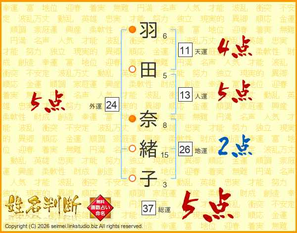 羽(6画)田(5画) 奈(8画)緒(15画)子(3画)