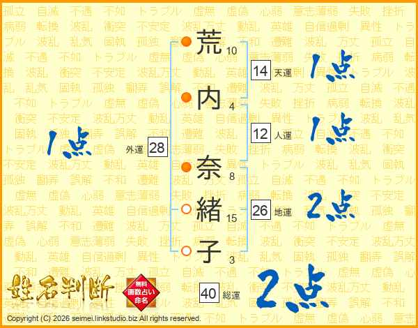 荒(10画)内(4画) 奈(8画)緒(15画)子(3画)