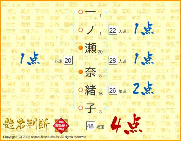 一ノ瀬奈緒子さんの総運は48画の4点!