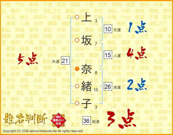 上坂奈緒子さんの総運は36画の3点!
