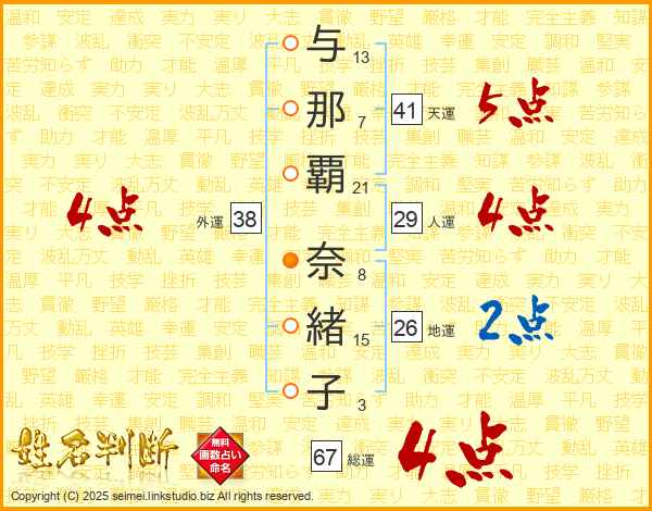 与(13画)那(7画)覇(21画) 奈(8画)緒(15画)子(3画)