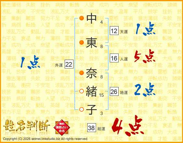 中(4画)東(8画) 奈(8画)緒(15画)子(3画)