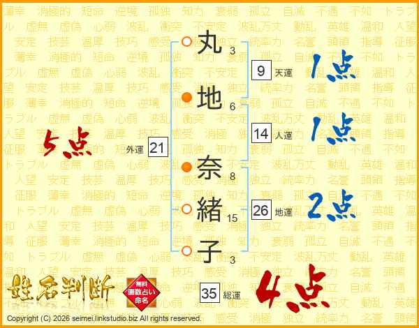 丸(3画)地(6画) 奈(8画)緒(15画)子(3画)