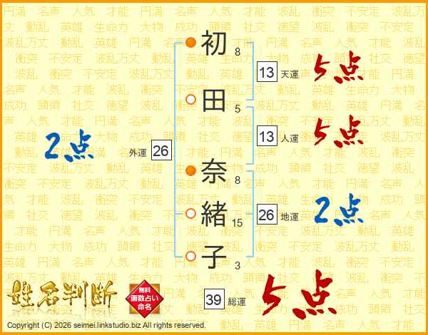 初(8画)田(5画) 奈(8画)緒(15画)子(3画)