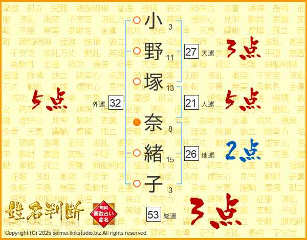 小(3画)野(11画)塚(13画) 奈(8画)緒(15画)子(3画)