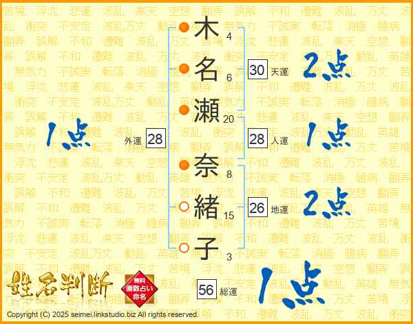 木(4画)名(6画)瀬(20画) 奈(8画)緒(15画)子(3画)