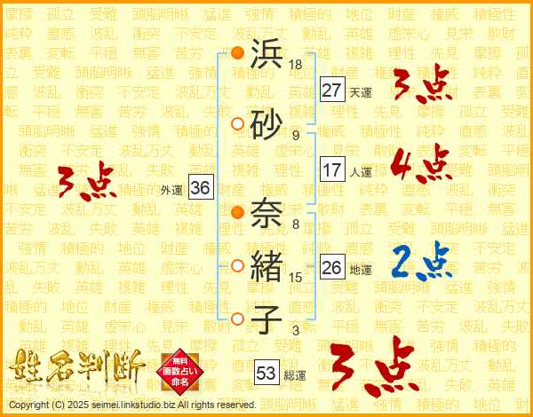 浜(18画)砂(9画) 奈(8画)緒(15画)子(3画)