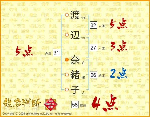 渡(13画)辺(19画) 奈(8画)緒(15画)子(3画)