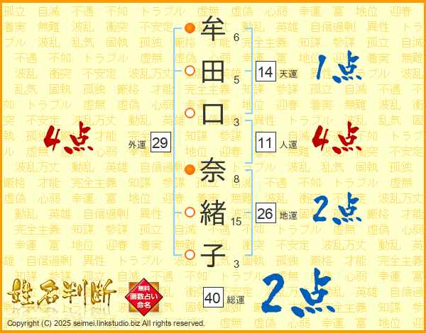 牟(6画)田(5画)口(3画) 奈(8画)緒(15画)子(3画)