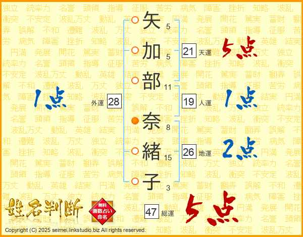 矢(5画)加(5画)部(11画)  奈(8画)緒(15画)子(3画)