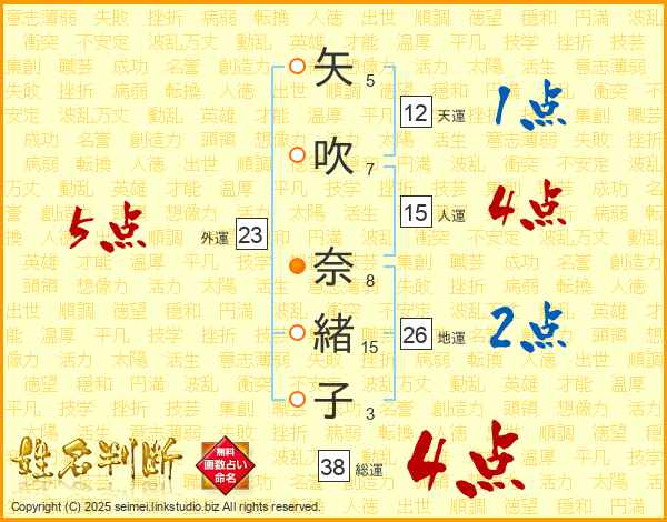 矢(5画)吹(7画) 奈(8画)緒(15画)子(3画)