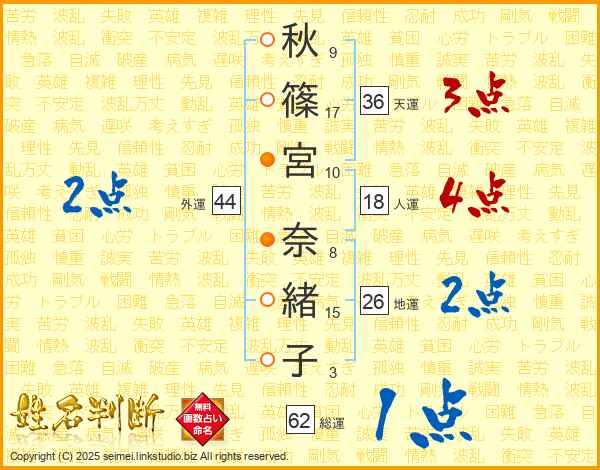 秋(9画)篠(17画)宮(10画) 奈(8画)緒(15画)子(3画)