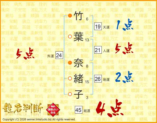 竹(6画)葉(13画) 奈(8画)緒(15画)子(3画)