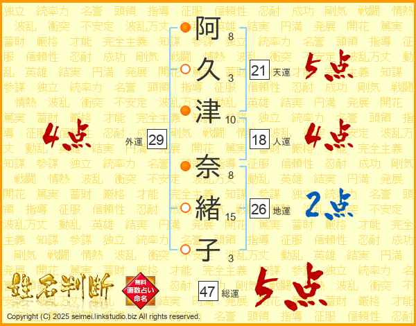 阿(8画)久(3画)津(10画) 奈(8画)緒(15画)子(3画)