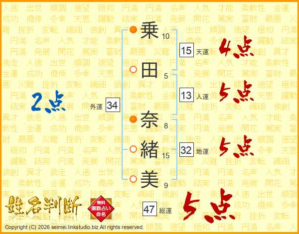 乗(10画)田(5画) 奈(8画)緒(15画)美(9画)