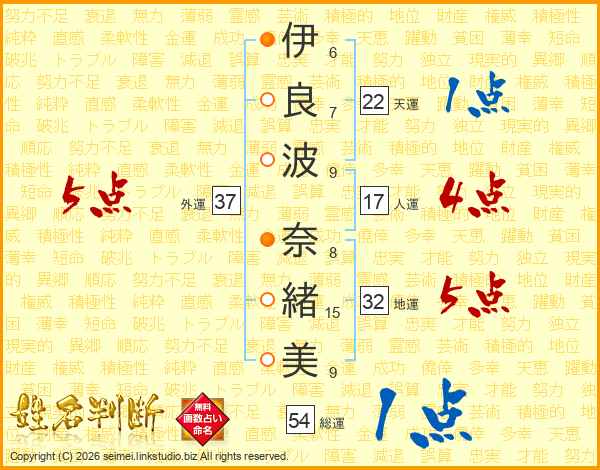 伊(6画)良(7画)波(9画) 奈(8画)緒(15画)美(9画)