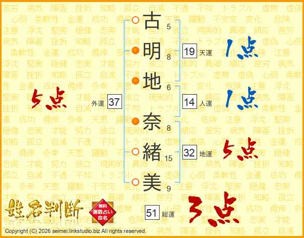 古(5画)明(8画)地(6画) 奈(8画)緒(15画)美(9画)