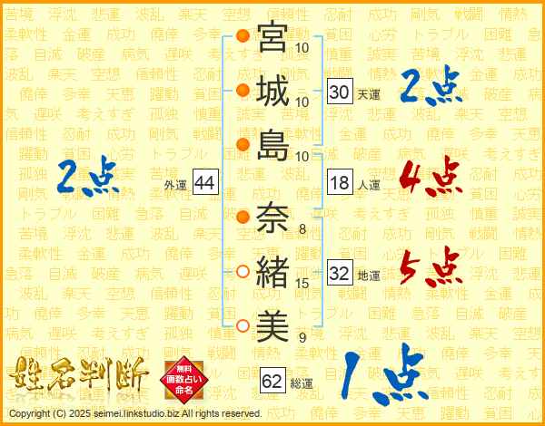宮(10画)城(10画)島(10画) 奈(8画)緒(15画)美(9画)