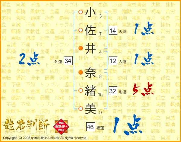小(3画)佐(7画)井(4画) 奈(8画)緒(15画)美(9画)