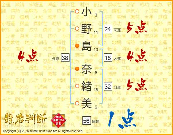 小(3画)野(11画)島(10画) 奈(8画)緒(15画)美(9画)
