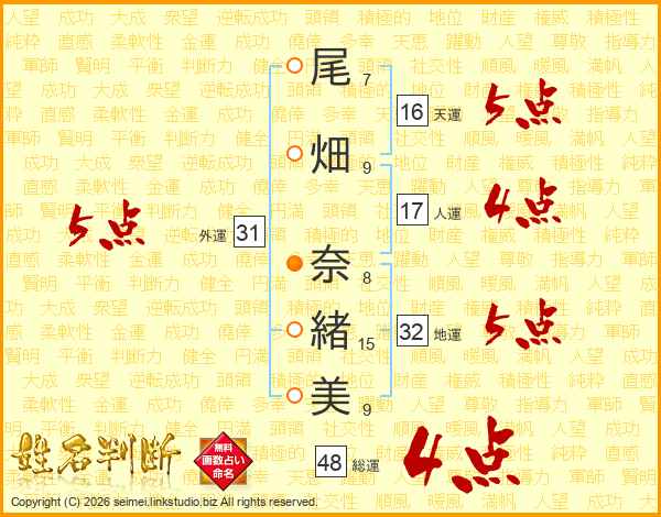 尾(7画)畑(9画) 奈(8画)緒(15画)美(9画)