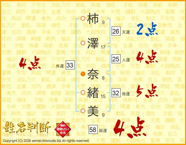 柿(9画)澤(17画) 奈(8画)緒(15画)美(9画)
