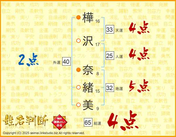 樺(16画)沢(17画) 奈(8画)緒(15画)美(9画)